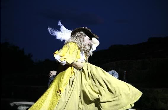 C’est ainsi que le théâtre, ici, met en fiction le débat, et donc la représentation dans sa vocation communautaire civique, au travers des figures de Dom Juan et de Sganarelle. Dom Juan se confronte à l’opinion publique, il est celui qui fait débat et qui provoque le débat. Dom Juan va se servir du théâtre, et d’emblée, en enfreindre les règles. Car si, chez Molière, la scène nous montre que la société est un théâtre, c’est aussi parce qu’à l’inverse la question du théâtre, ce qu’on peut en faire, sa nécessité, est posée à la société. Dom Juan et Sganarelle, débarquant à Alba-la-Romaine, vont mettre en jeu le lieu, le public, le plateau au service de leurs convictions. Dom Juan va prendre le risque suprême de jouer, à son profit, sans scrupule, sans respect, des codes de théâtre, qui, forcé dans son intégrité,-finira par se retourner contre lui. »
